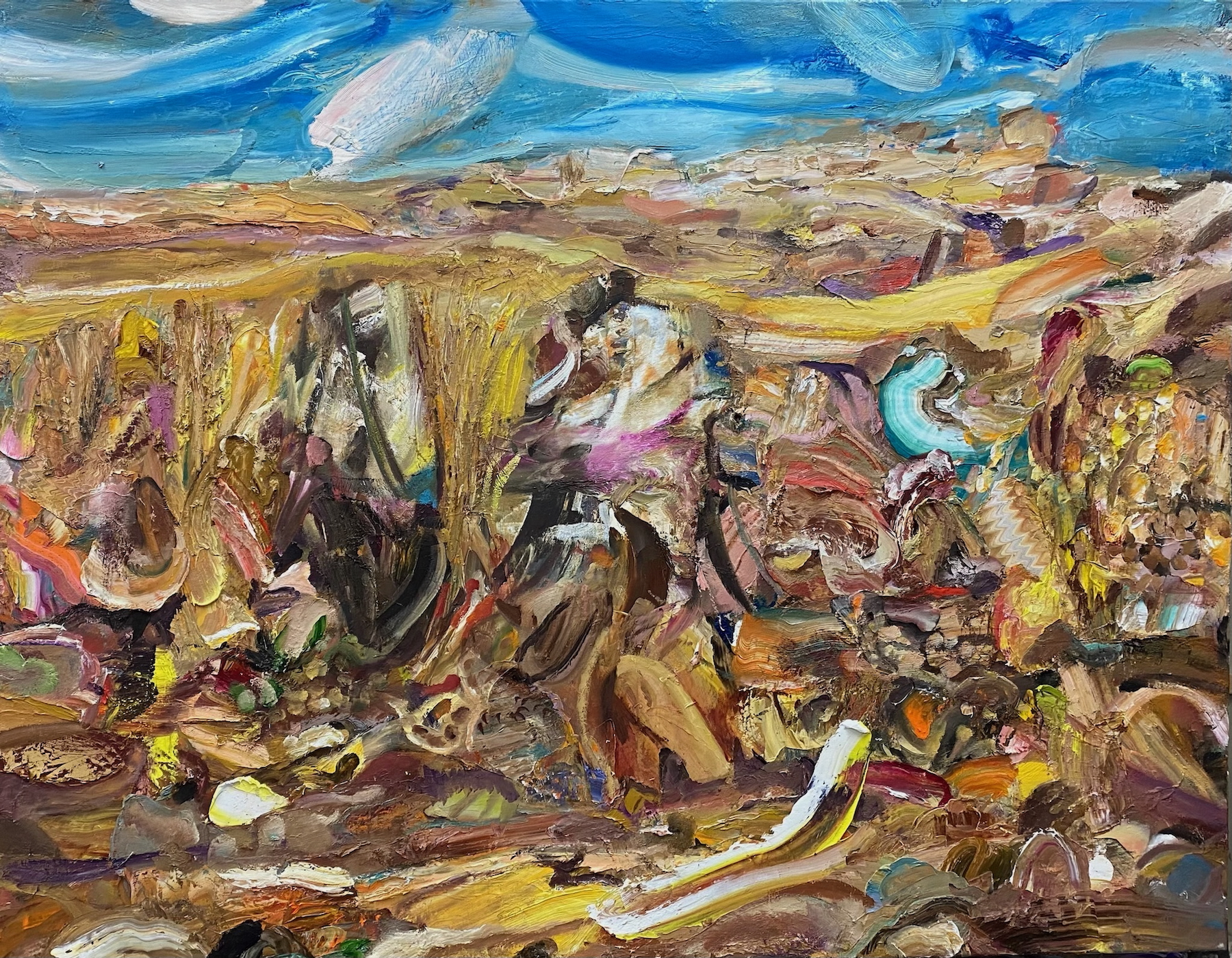 Bevor wasserlösliche Ölfarben auf die Leinwand kommen, legt sie eine erste Komposition an. Dann beginnt ein ständiger Wandel: Farben werden aufgetragen, verwischt, mit Lappen oder Schwamm entfernt, verändert und wieder neu gesetzt. Und wenn der Pinsel nicht ausreicht, greift sie zu ihren Fingern, um Formen und Inhalte so lange zu modellieren, bis sie spürbar werden. So entstehen Werke, die sich nicht erklären lassen wollen, sondern erlebt werden müssen.